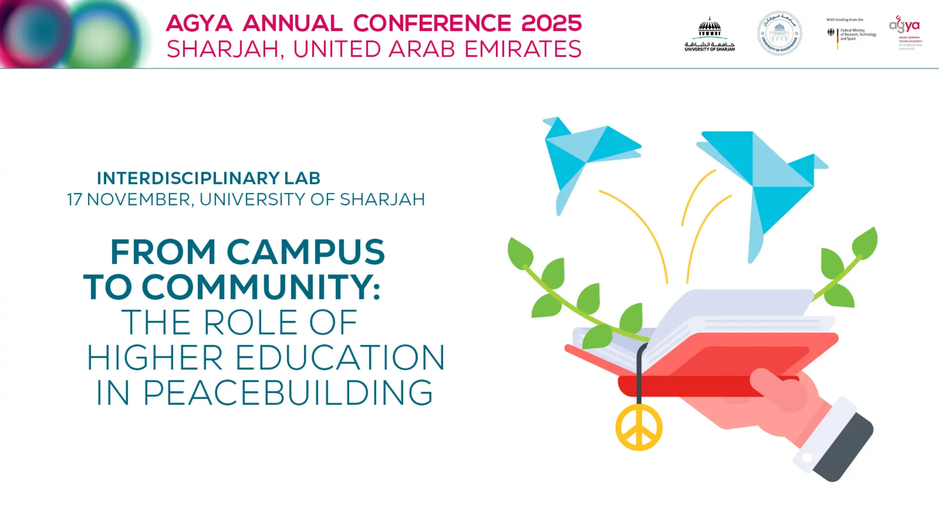The dynamic program of this lab begins with a keynote address from two-time Nobel Peace Prize nominee John Katsos, followed by short inspiration sparks by Arab and German experts in peace education from UoS, AGYA, and beyond. Participants then partake in “Peace in Practice”, a format for small, action-focused groups to go through interactive challenge stations on rebuilding education in post-conflict regions, countering digital disinformation, and strengthening legal frameworks for reconciliation.